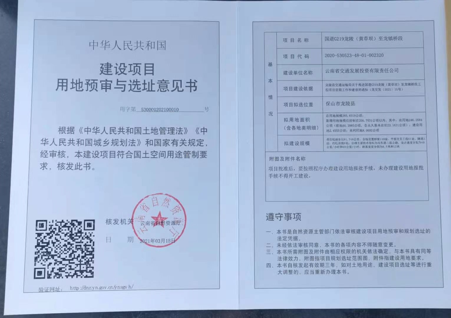 8.地址灾害评估意见(国道G219龙陵(黄草坝)至龙镇桥段工程建设项目地质灾害危险性评估专家组评审意见)。 (点击下载附件查看) 9.水土保持批复(国道G219龙陵(黄草坝)至龙镇桥段工程-云水许可〔2023〕8号)(点击下载附件查看) 10.洪水影响评价批复( 云南省水利厅关于准予国道G219龙陵(黄草坝)至龙镇桥段洪水影响评价审批的行政许可决定书) (点击下载附件查看) 11.用地征转批复 (点击下载附件查看) |